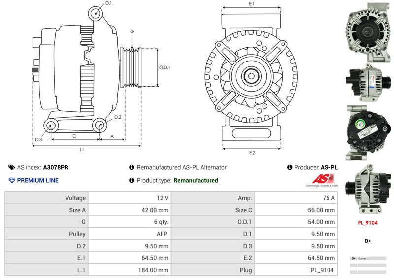 AS-PL A3078PR - Alternador - Remanufacturado AS-PL