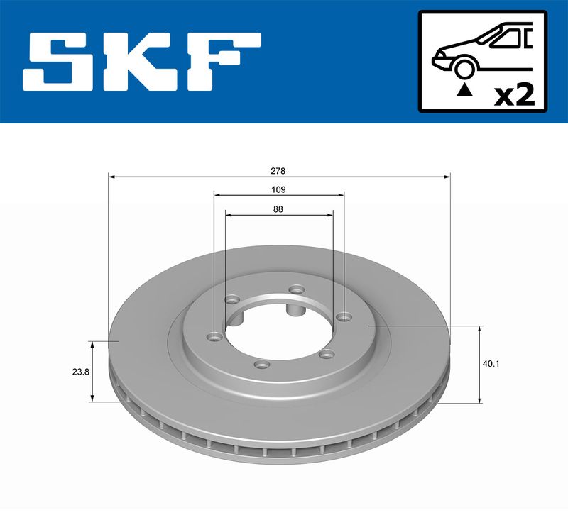 Lado de montaje: Eje delantero Tipo de disco de frenos: ventilación interna Diámetro exterior [mm]: 278 Espesor de disco de frenos [mm]: 24 Altura [mm]: 40 corona de agujeros - Ø [mm]: 109 Diámetro de centrado [mm]: 88 Número de orificios: 6 Superficie: revestido Espesor mínimo [mm]: 22
